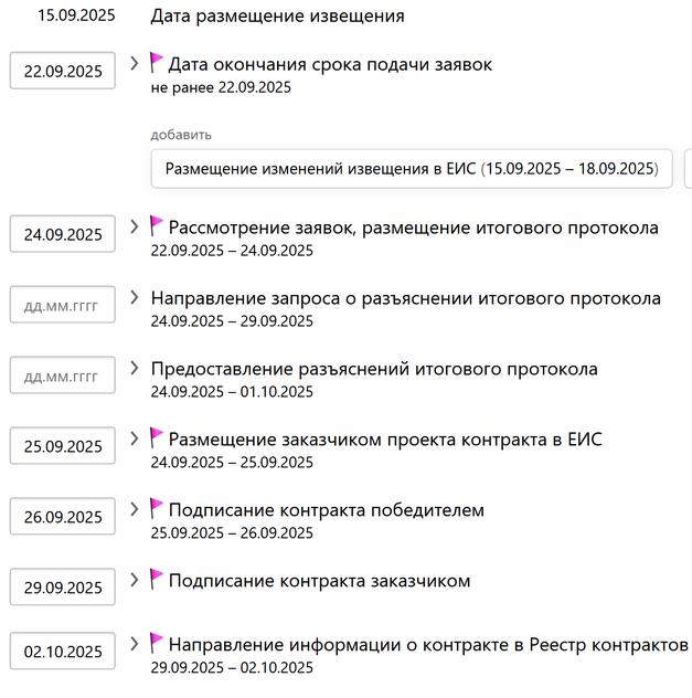 Кроме того, вы можете добавить в график процедуры изменения извещения и отмены закупки. Сервис сделает перерасчет с их учетом.