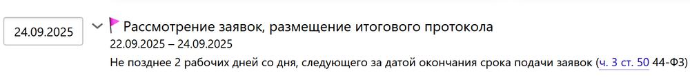 Сервис рассчитает сроки открытых процедур электронного аукциона, конкурса и запроса котировок в зависимости от планируемой даты извещения и параметров закупки. Для каждого срока в графике представлено обоснование со ссылками на нормы закона.